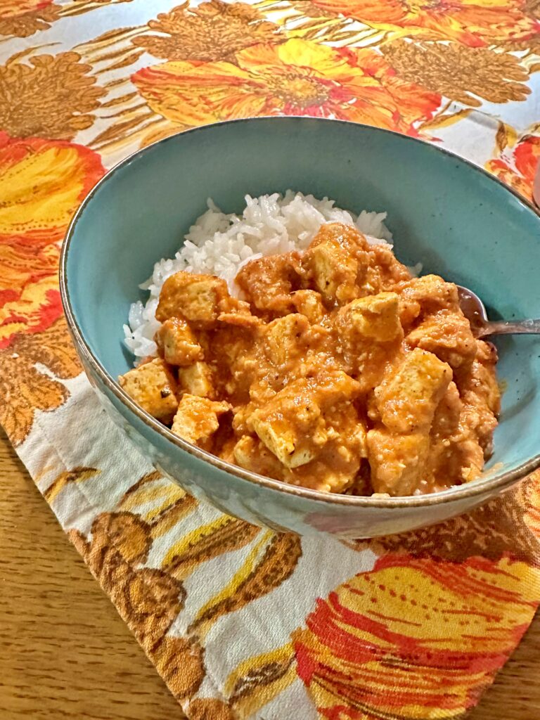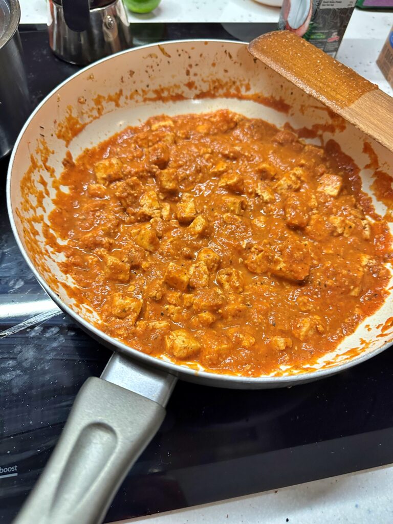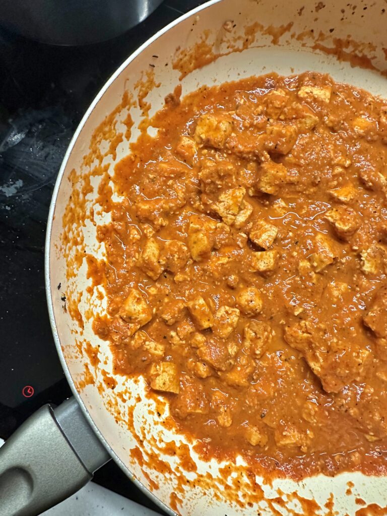 - Tofu pokrój w kostkę i podsmaż na rumiano. Dodaj Tandori Masala i sos sojowy.